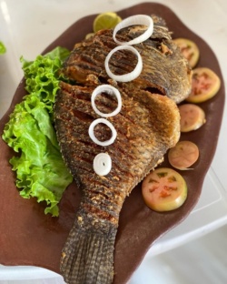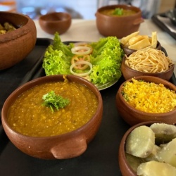BAIÃO, SALADA, MACAXEIRA NA MAIONESE, BATATA DOCE E PIRÃO.